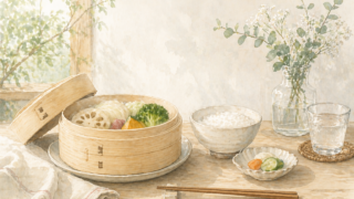 せいろに重ねるだけで完成する簡単蒸しレシピ。厚揚げ・白菜・豚バラ・キムチでボリューム満点なのにヘルシー。放置調理で忙しい日にもぴったりの一品です。