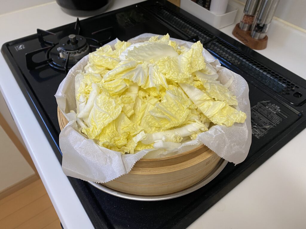 せいろに白菜を敷き詰めます。
