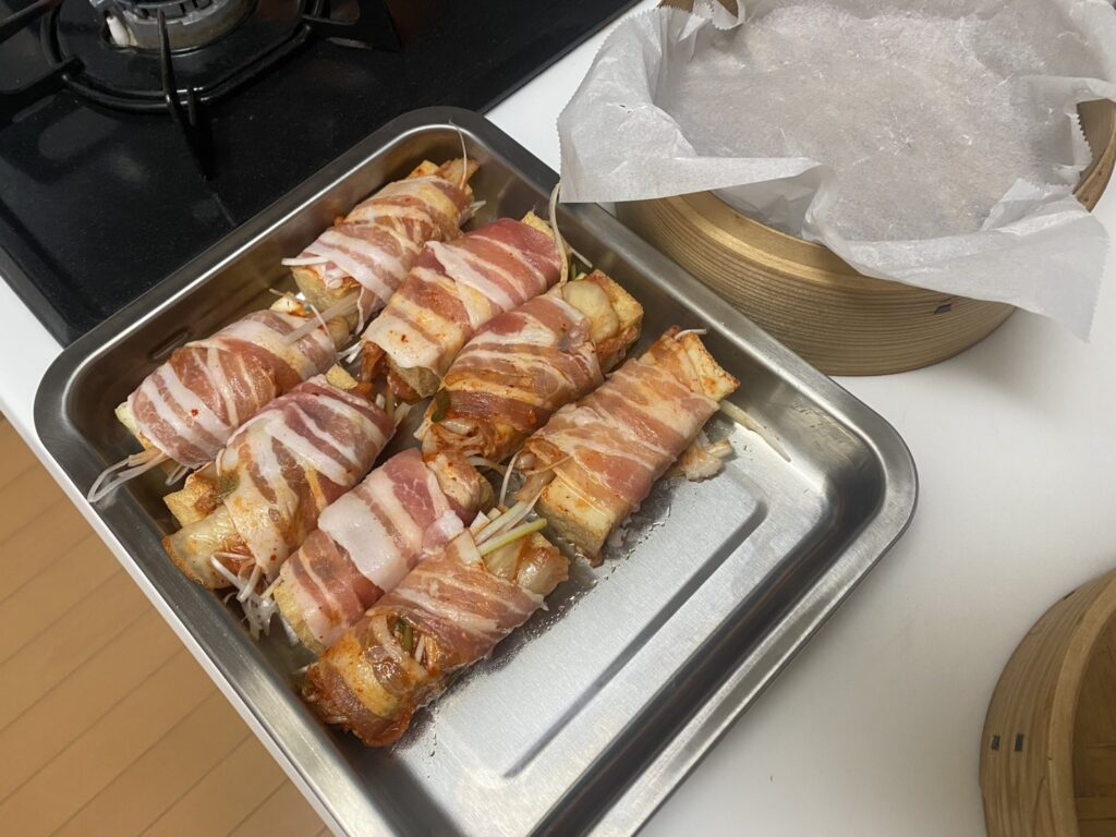 厚揚げにキムチを乗せて豚バラでくるっと。
