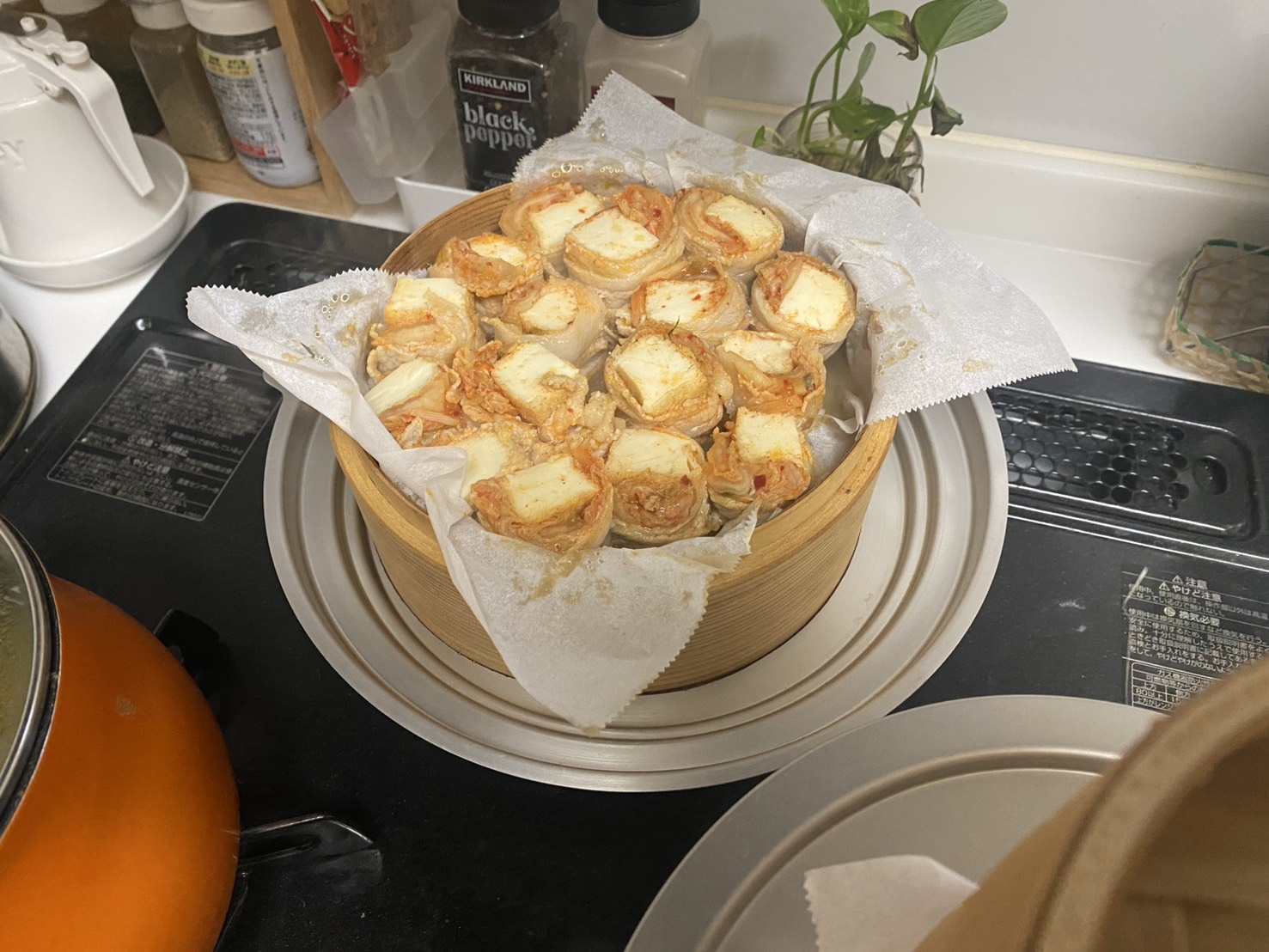 「厚揚げのキムチ豚バラ巻き」せいろ蒸しをご紹介します。