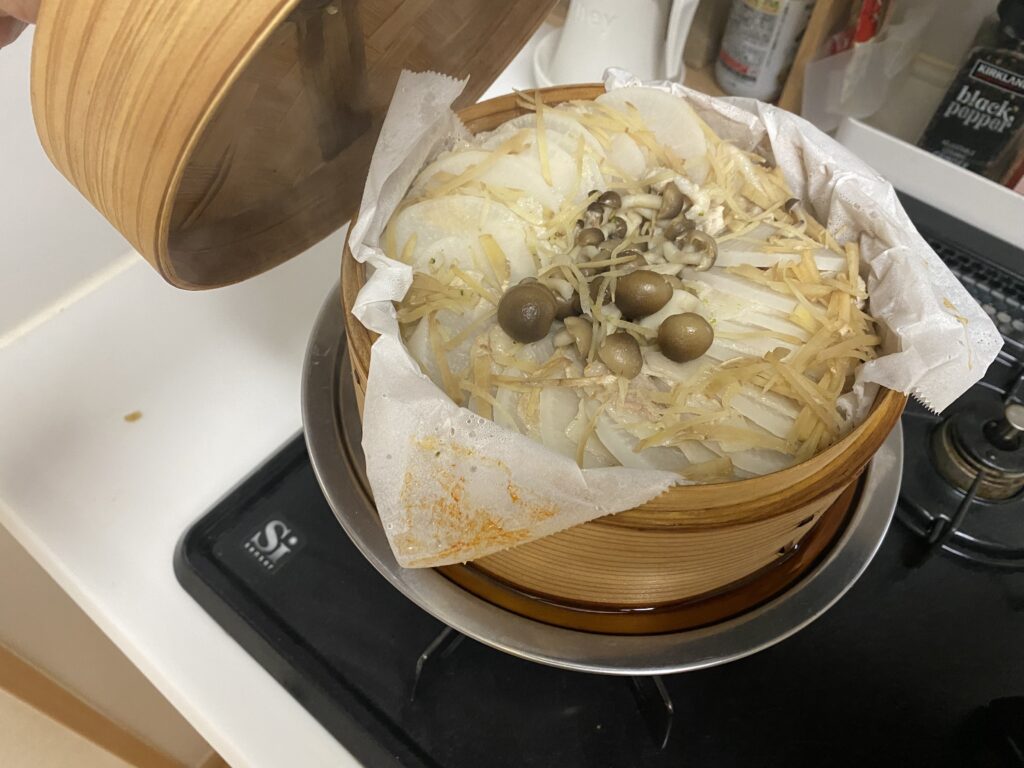 大根を薄切りにして、豚バラとショウガを重ねて蒸すだけ。